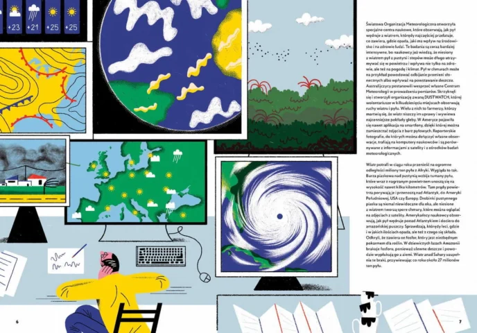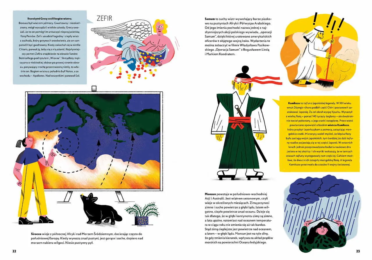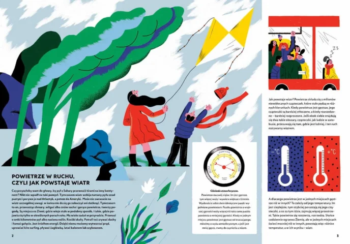 Ta książka zabierze was w niezwykłą podróż. Zobaczycie, co dzieje się, gdy nadciąga tornado, dokąd wędruje pył znad Sahary i jak szybuje albatros. Dowiecie się, jak powstaje wiatr i jak z niego zrobić prąd. Dotrzecie do nowoczesnych farm wiatrowych u wybrzeży Szkocji i do starodawnych wiatraków w Iranie. Przeczytacie o tym, gdzie wieje samum, a gdzie halny i kto szybował nad Himalajami. Będzie też na co popatrzeć, bo ilustracje zrobiły doskonałe polskie graficzki Agata Dudek i Małgorzata Nowak.